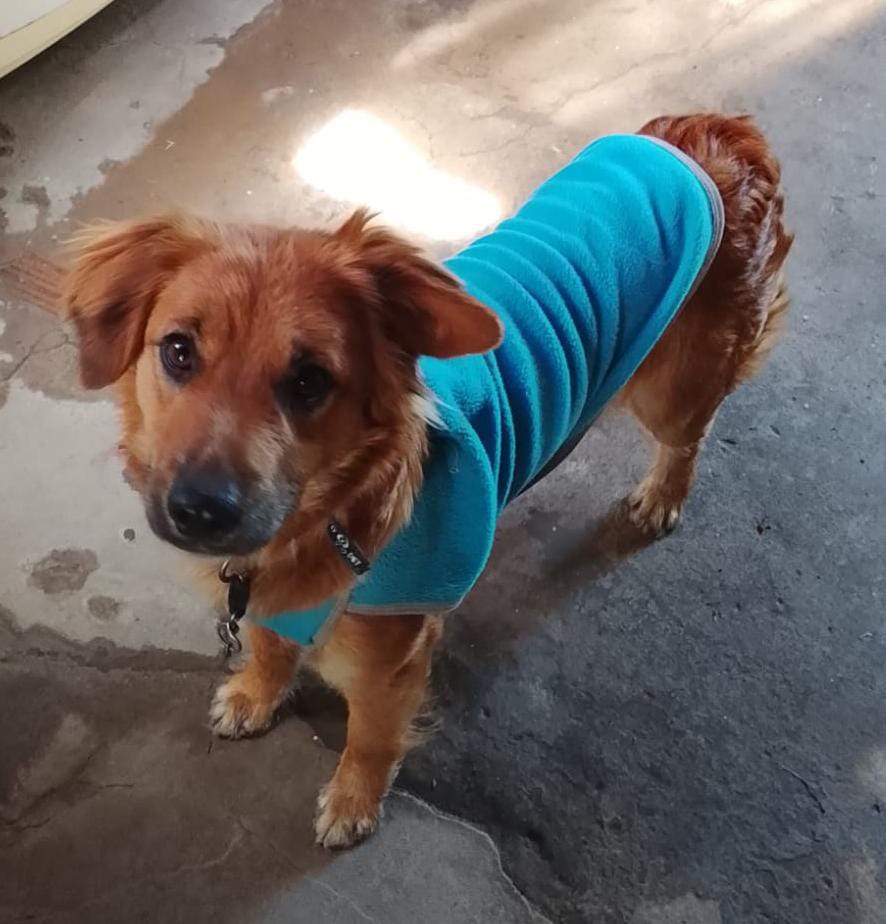 Apareció en calle 547 y 616 A, El Pato. Es macho con collar rojo y tiene un ponchito. ¿Nos ayudás a encontrar a su familia?