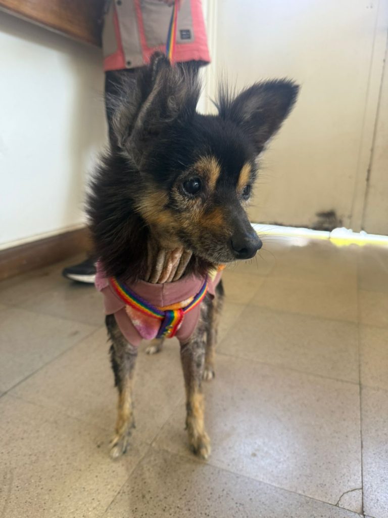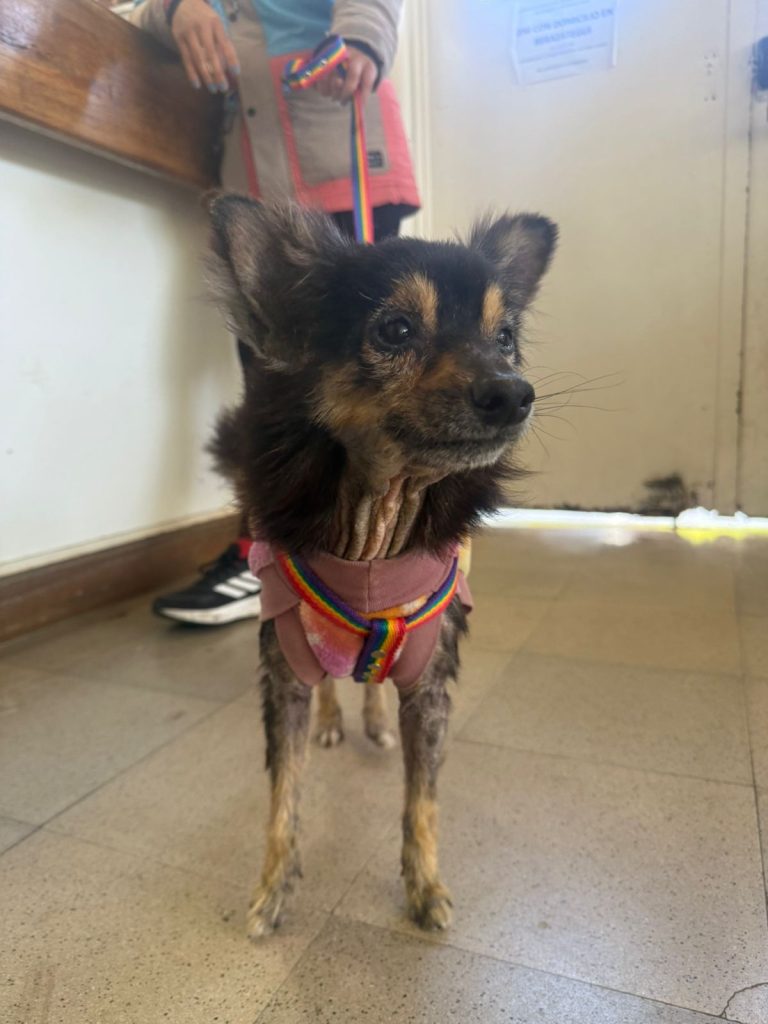 Este perrito macho fue encontrado en 144 y 21. Tiene pechera y ropita, su familia debe estar buscándolo.