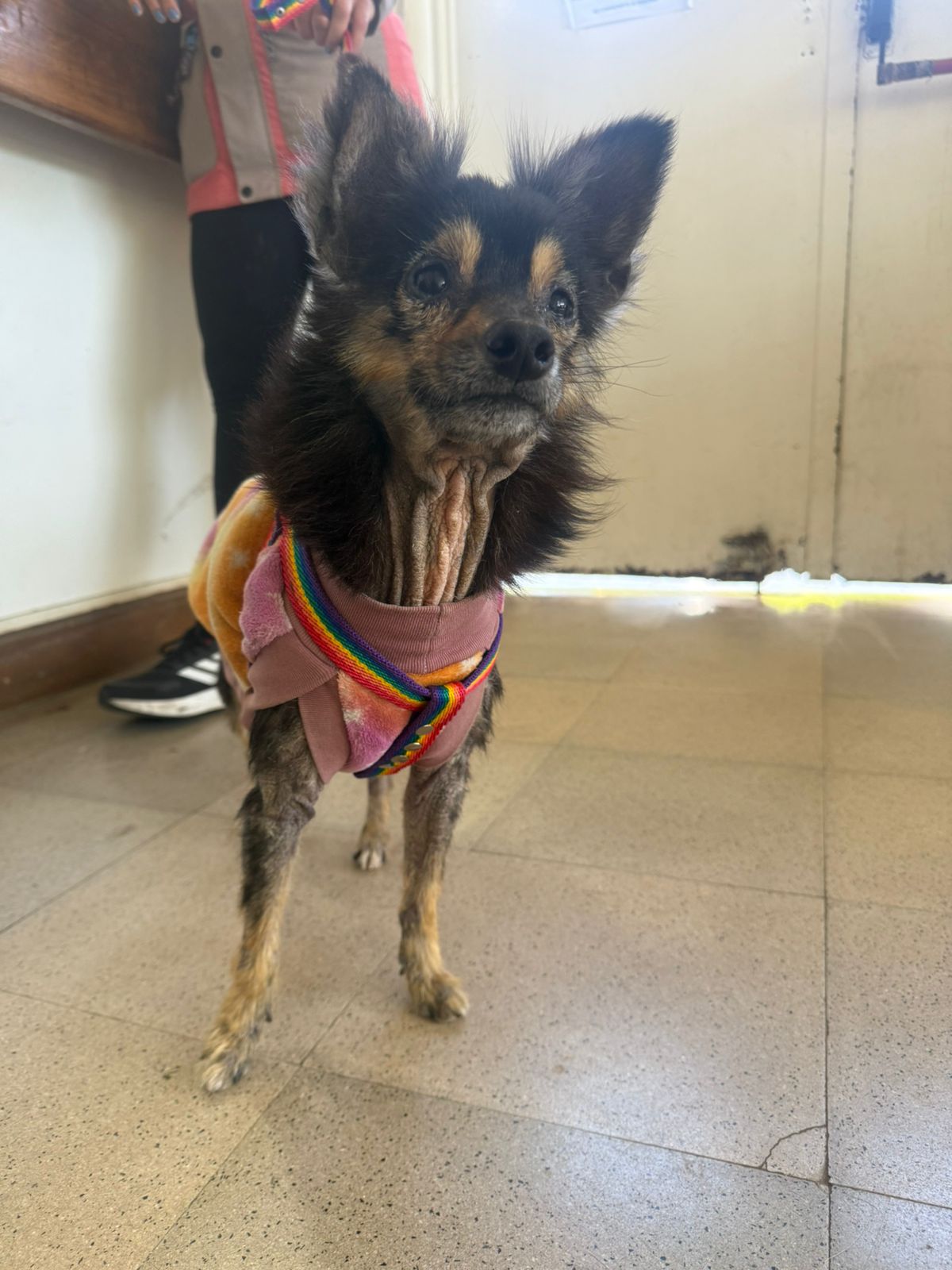 Este perrito macho fue encontrado en 144 y 21. Tiene pechera y ropita, su familia debe estar buscándolo.