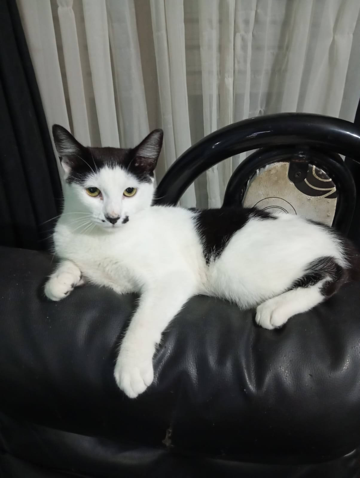 Es de color blanco con manchitas negras y está castrada.