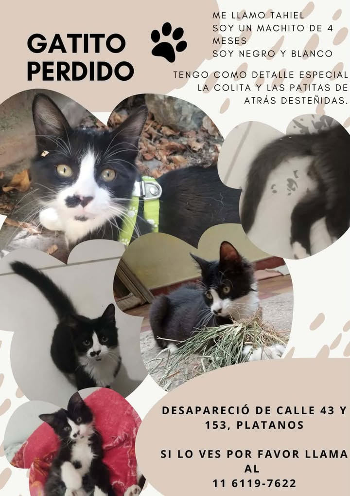 Es un gatito de 4 meses, negro y blanco, que desapareció en calle 43 y 153 (Plátanos). Tiene la colita y las patitas de atrás desteñidas. ¿Nos ayudás a difundir esta publicación? Su familia está muy triste.